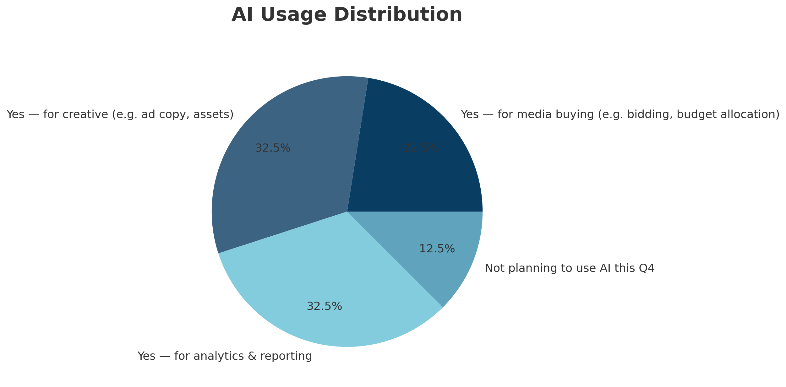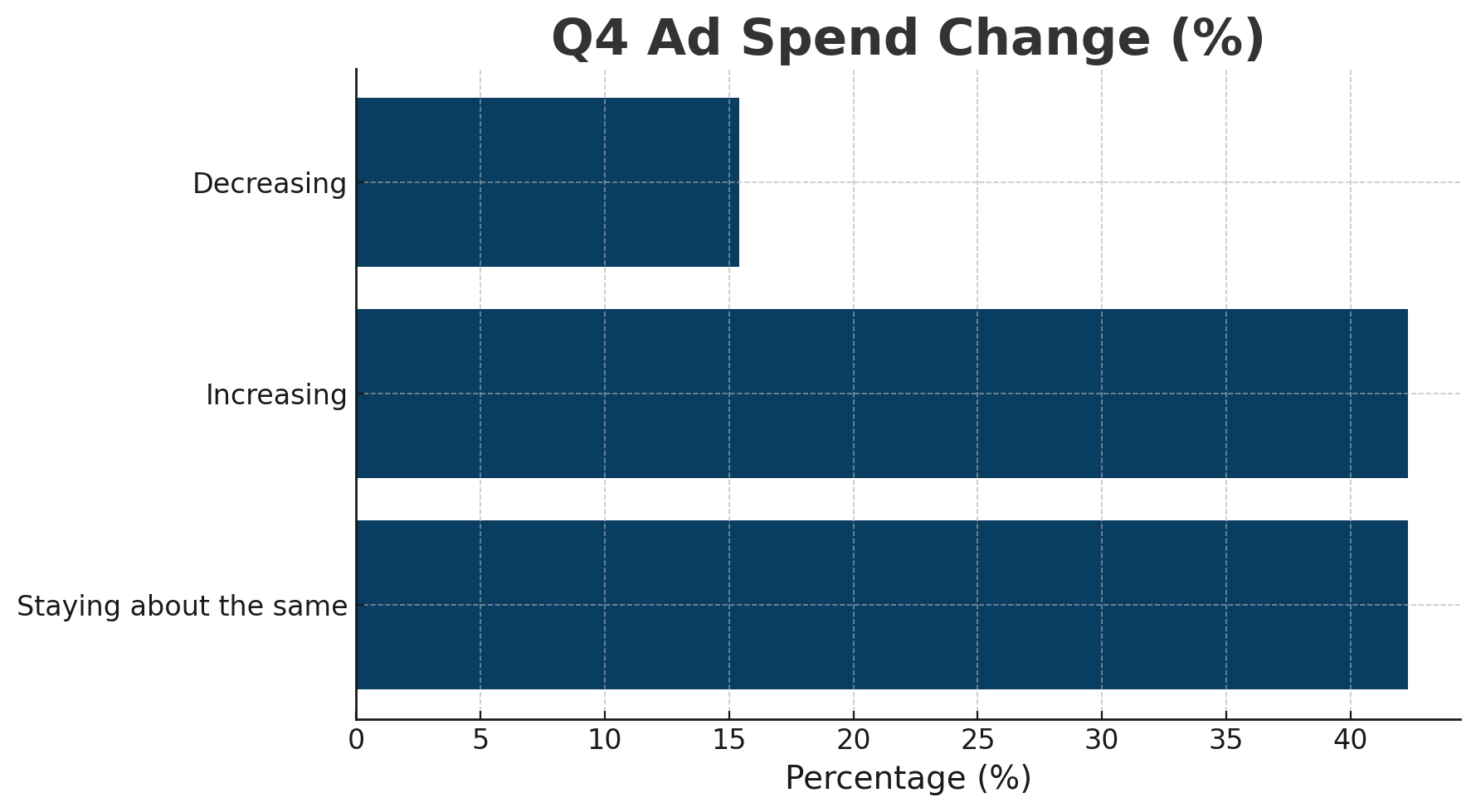 Across industries, one theme stands out: brands are not pulling back this Q4. In fact, 84.6% of respondents are either maintaining or increasing their ad budgets. Half are increasing spend, half are holding steady, and only a small minority — just 15.4% — are cutting back. This is in tandem with the survey revealing a generally optimistic outlook for Q4, 2025.